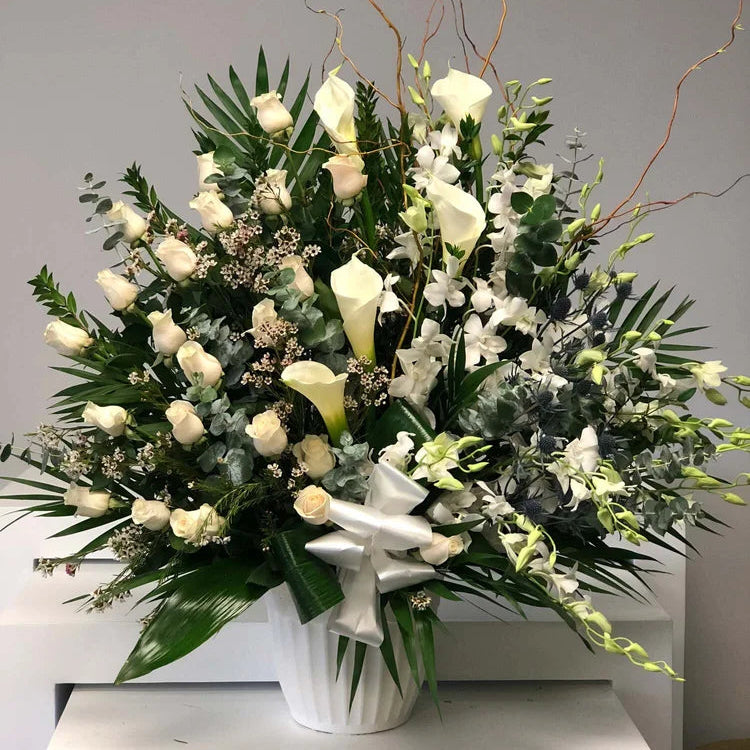Eternal Grace is filled with Roses, Dendrobium Orchids and Calla Lilies. As shown $200.00+HST.