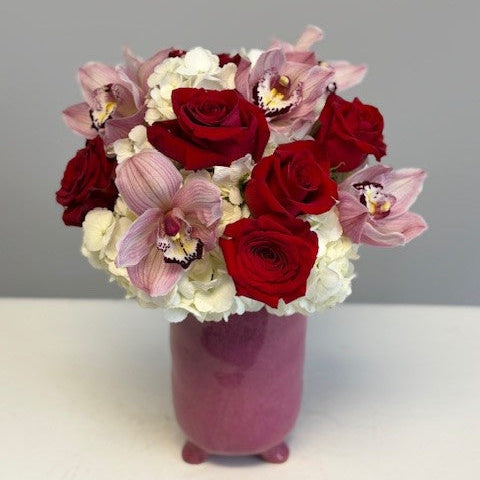Velvety red roses, delicate blush orchids and soft white hydrangeas designed in a keepsake dusty pink ceramic vase to create Rosy Romance - A perfect gift for Valentine's Day, Anniversaries or Anytime you want to say "I love You" without words!
