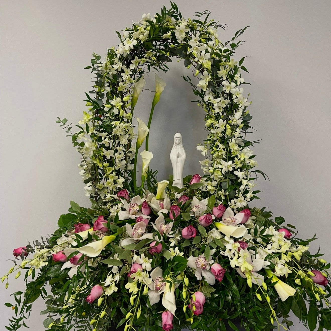 This arrangement is filled with an abundance of white calla lilies, roses, orchids and a floral dome with an angel or madonna figurine in its centre. Shown is Medium $550.00+HST.