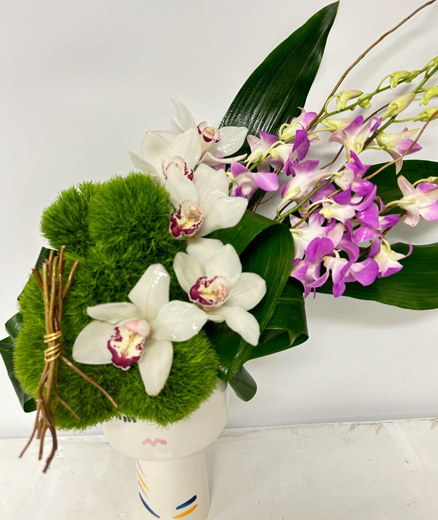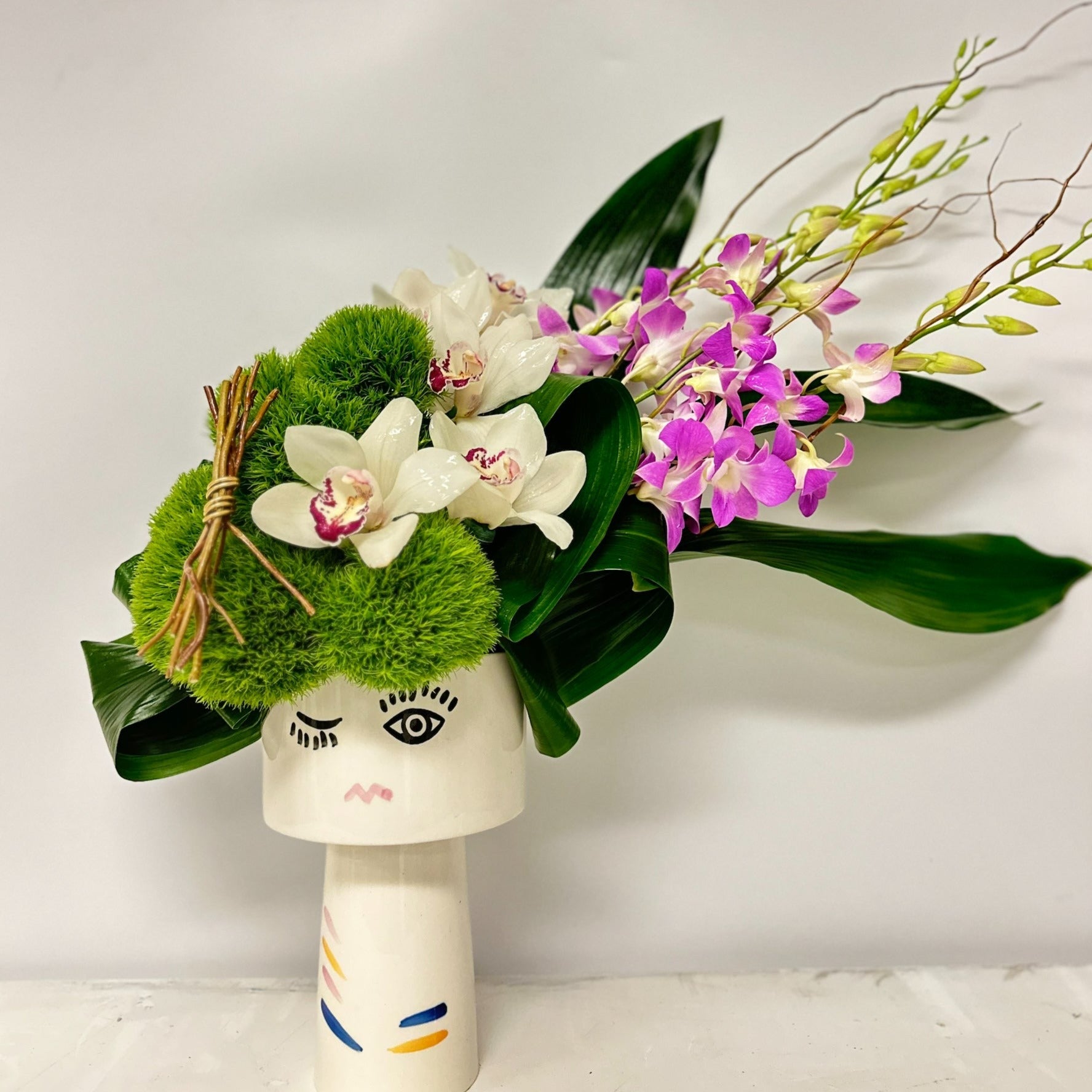 This artistic design is created in blush and lavender tones with orchids, lisianthus, stock and roses in a keepsake femme face vessel and finished with a sparkle broach.